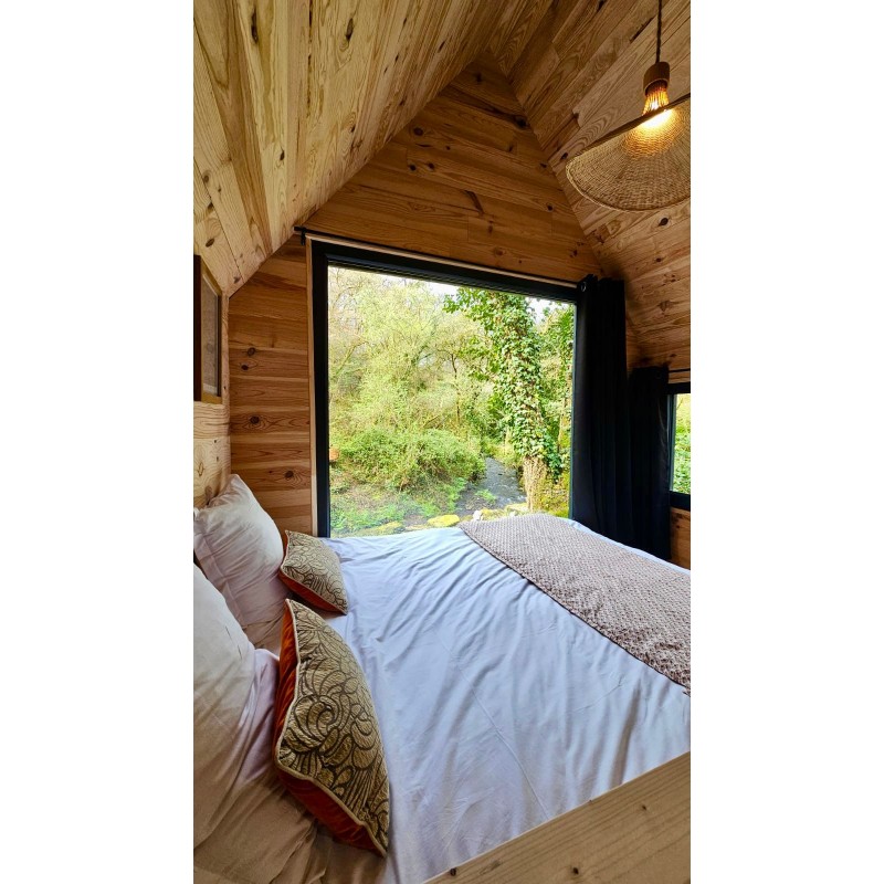 Sa grande baie vitrée, occupant toute une façade, fait face à la rivière et offre depuis le lit une vue directe sur l’eau, la forêt environnante et le ciel étoilé.