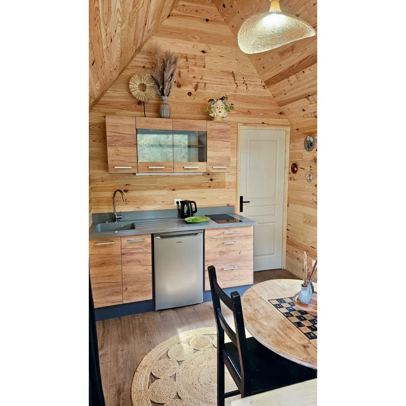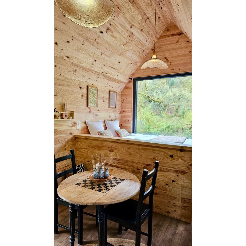 La cabane se compose d’un espace unique, optimisé et chaleureux, comprenant :