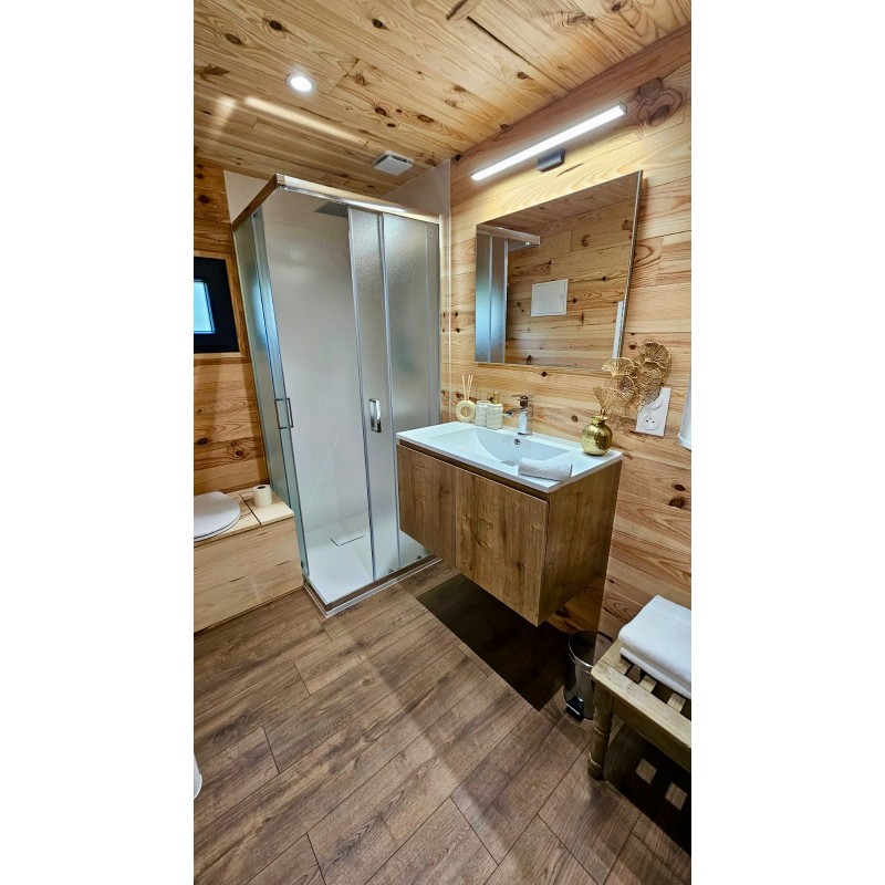 La cabane dispose d’une salle d’eau indépendante de la pièce principale, entièrement intégrée au logement.